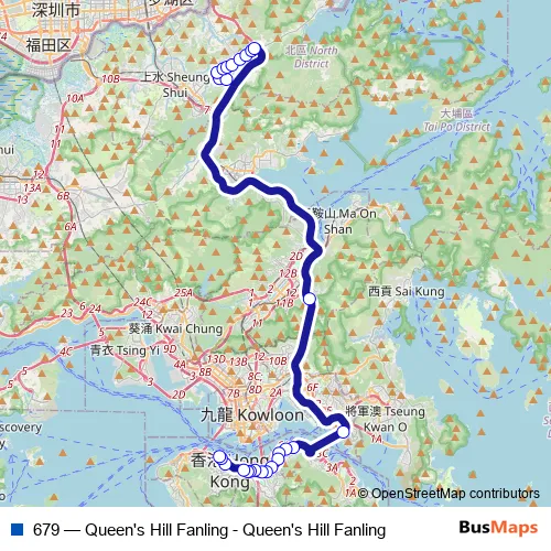 The first stop of the 679 bus route is Queen's Hill Estate and the last stop is Hong Kong Station. 679 (Queen's Hill Fanling - Queen's Hill Fanling) is operational during on weekdays.