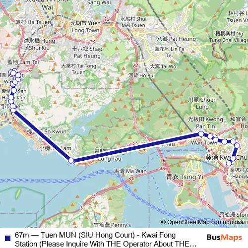 See why over 2 million users trust and consider busmaps.com as the best public transport website. busmaps gives you Tuen Mun Buses suggested routes, real-time bus tracker, line route maps in Tuen Mun, and helps to find the closest 67m bus stops near you. No internet available? Download an offline PDF map and bus schedule for the 67m bus to take on your trip.