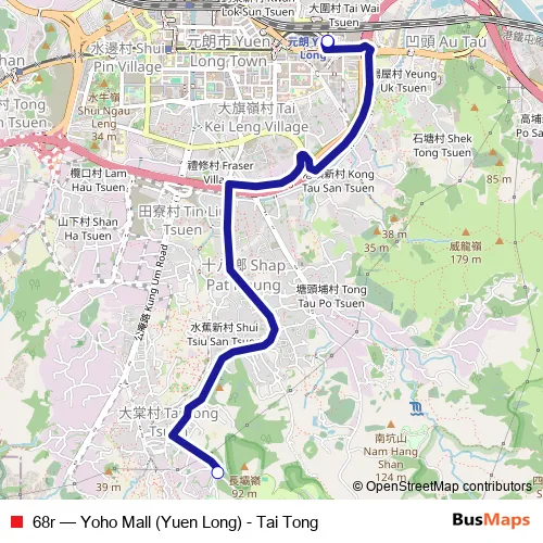 The first stop of the 68r bus route is Yoho Mall (Yuen Long) and the last stop is Tai Tong. 68r (Yoho Mall (Yuen Long) - Tai Tong) is operational during everyday.