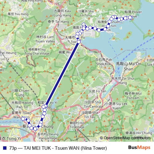 The first stop of the 73p bus route is [Kmb] TAI MEI TUK BUS Terminus and the last stop is [Ctb] Nina Tower|[Kmb] Nina Tower BUS Terminus|[Lwb] Nina Tower BUS Terminus. 73p (TAI MEI TUK - Tsuen WAN (Nina Tower)) is operational during on weekdays.