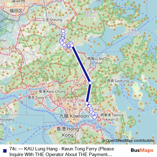 The first stop of the 74c bus route is [Kmb] KAU Lung Hang and the last stop is [Kmb] Kwun Tong Ferry. 74c (KAU Lung Hang - Kwun Tong Ferry (Please Inquire With THE Operator About THE Payment Arrangement OF THE TWO-WAY Fare ON This Route.)) is operational during on weekdays.