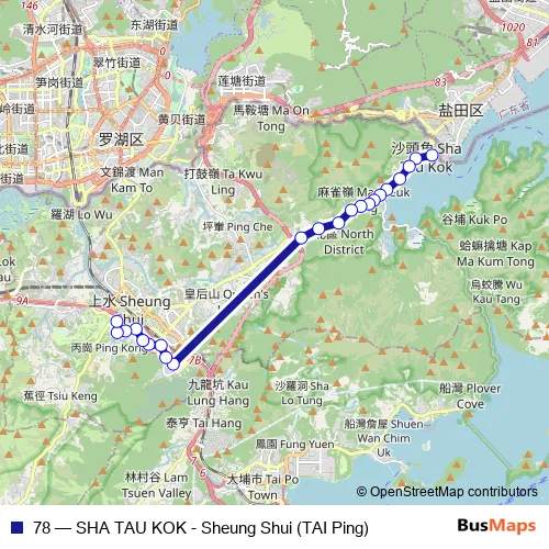 The first stop of the 78 bus route is [Kmb] SHA TAU KOK BUS Terminus and the last stop is [Kmb] TAI Ping BUS Terminus, North District Hospital. 78 (SHA TAU KOK - Sheung Shui (TAI Ping)) is operational during on weekdays.
