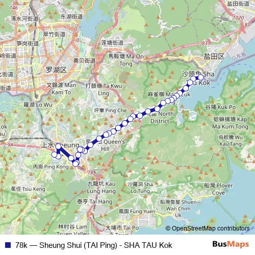 The first stop of the 78k bus route is [Kmb] SHA TAU KOK BUS Terminus and the last stop is [Kmb] TAI Ping BUS Terminus, North District Hospital. 78k (Sheung Shui (TAI Ping) - SHA TAU Kok) is operational during everyday.