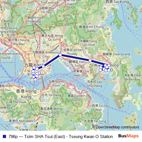 The first stop of the 796p bus route is [Ctb] Tsim SHA Tsui East|[Kmb] Tsim SHA Tsui East BUS Terminus and the last stop is [Ctb] Tseung Kwan O Station. 796p (Tsim SHA Tsui (East) - Tseung Kwan O Station) is operational during everyday.
