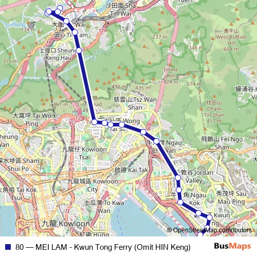 Mei LAM Estate|[Kmb] MEI LAM BUS Terminus|[Lwb] MEI LAM BUS Terminus and the last stop is [Kmb] Kwun Tong Ferry. 80 (MEI LAM - Kwun Tong Ferry (Omit HIN Keng)) is operational during on weekdays.