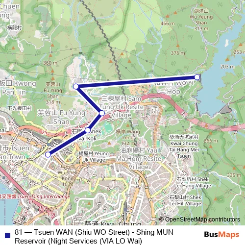 Click here to view the nearest 81 - Tsuen WAN (Shiu WO Street) - Shing MUN Reservoir (Night Services (VIA LO Wai) bus stop.
