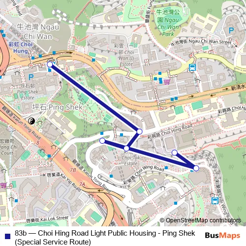 The first stop of the 83b bus route is Choi Hing Road, Light Public Housing|Choi Hing Road Light Public Housing and the last stop is 1/F Ping Shek Public Transport Interchange. 83b (Choi Hing Road Light Public Housing - Ping Shek (Special Service Route)) is operational during everyday.