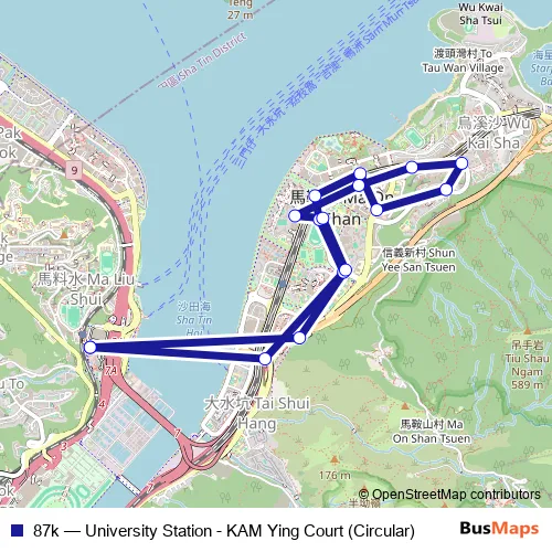 The first stop of the 87k bus route is [Ctb] University Station|[Kmb] University Station and the last stop is [Ctb] University Station|[Kmb] University Station. 87k (University Station - KAM Ying Court (Circular)) is operational during everyday.