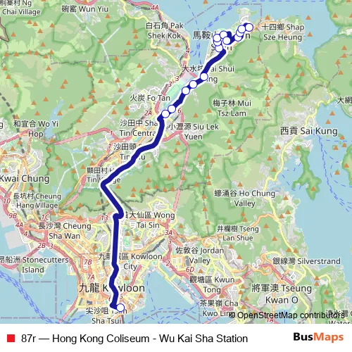 The first stop of the 87r bus route is Hong Kong Coliseum and the last stop is Wu Kai Sha Station. 87r (Hong Kong Coliseum - Wu Kai Sha Station) is operational during everyday.