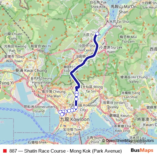 The first stop of the 887 bus route is Sha Tin Race Course Bus Terminus and the last stop is Mong Kok (Park Avenue) Bus Terminus. 887 (Shatin Race Course - Mong Kok (Park Avenue)) is operational during everyday.