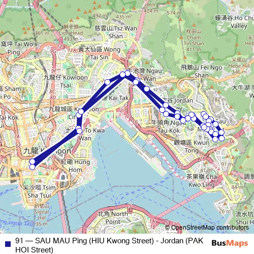 The first stop of the 91 bus route is PAK HOI Street and the last stop is PAK HOI Street. 91 (SAU MAU Ping (HIU Kwong Street) - Jordan (PAK HOI Street)) is operational during everyday.