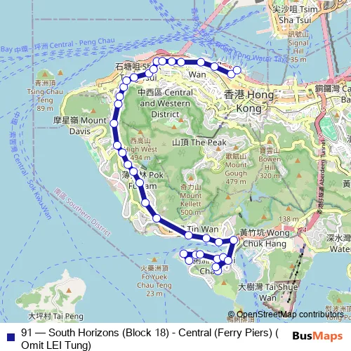 Click here to view the nearest 91 - South Horizons (Block 18) - Central (Ferry Piers) (Omit LEI Tung) bus stop.