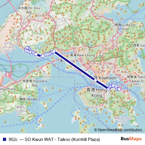 See why over 2 million users trust and consider busmaps.com as the best public transport website. busmaps gives you Tuen Mun Buses suggested routes, real-time bus tracker, line route maps in Tuen Mun, and helps to find the closest 952c bus stops near you. No internet available? Download an offline PDF map and bus schedule for the 952c bus to take on your trip.