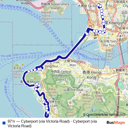 The first stop of the 971r bus route is Cyberport and the last stop is Residence Bel-Air, Cyberport Road. 971r (Cyberport (via Victoria Road) - Cyberport (via Victoria Road)) is operational during everyday.