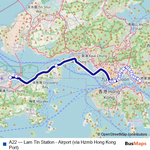 The first stop of the A22 bus route is Airport (Ground Transportation Centre) and the last stop is Lam Tin Station. A22 (Lam Tin Station - Airport (via Hzmb Hong Kong Port)) is operational during everyday.