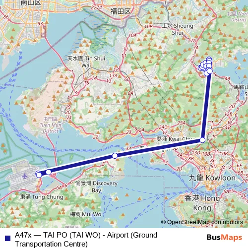 See why over 2 million users trust and consider busmaps.com as the best public transport website. busmaps gives you Tai Po Buses suggested routes, real-time bus tracker, line route maps in Tai Po, and helps to find the closest A47x bus stops near you. No internet available? Download an offline PDF map and bus schedule for the A47x bus to take on your trip.