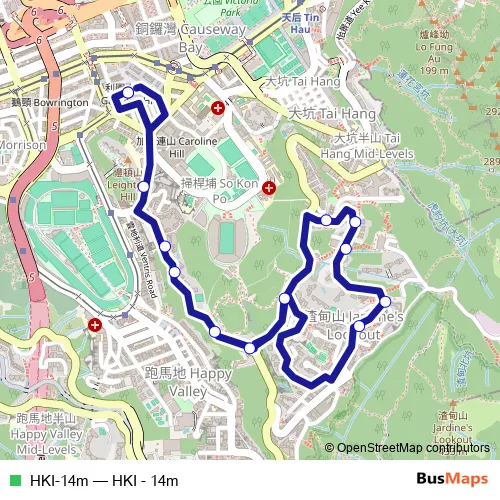 The first stop of the HKI-14m bus route is Near Lee Garden One, Lan Fong Road and the last stop is Near Lee Garden One, Lan Fong Road. HKI-14m (HKI - 14m) is operational during everyday.