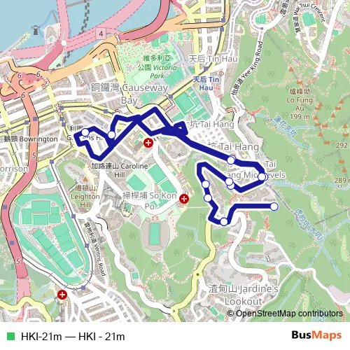 The first stop of the HKI-21m bus route is Near Lee Garden One, Lan Fong Road and the last stop is Near Lee Garden One, Lan Fong Road. HKI-21m (HKI - 21m) is operational during everyday.