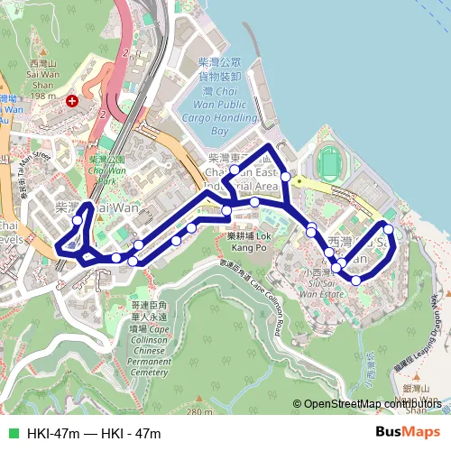 The first stop of the HKI-47m bus route is Chai Wan Station Public Transport Interchange and the last stop is Chai Wan Station Public Transport Interchange. HKI-47m (HKI - 47m) is operational during everyday.