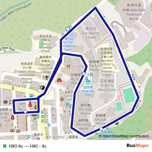The first stop of the HKI-4s bus route is Shek Pai Wan Estate Public Transport Interchange and the last stop is Shek Pai Wan Estate Public Transport Interchange. HKI-4s (HKI - 4s) is operational during everyday.