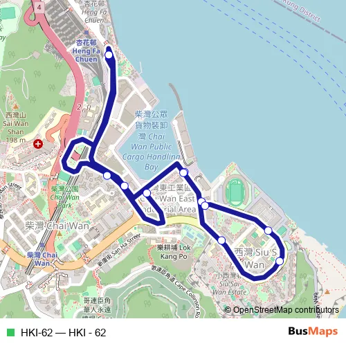 The first stop of the HKI-62 bus route is Heng Fa Chuen Public Transport Interchange and the last stop is Heng Fa Chuen Public Transport Interchange. HKI-62 (HKI - 62) is operational during everyday.