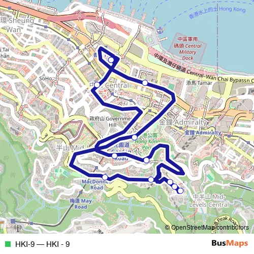 The first stop of the HKI-9 bus route is Central (Exchange Square) and the last stop is Central (Exchange Square). HKI-9 (HKI - 9) is operational during everyday.