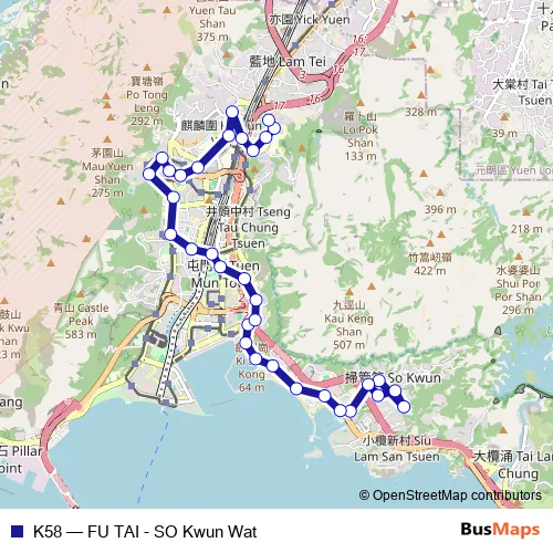 See why over 2 million users trust and consider busmaps.com as the best public transport website. busmaps gives you Tuen Mun Buses suggested routes, real-time bus tracker, line route maps in Tuen Mun, and helps to find the closest K58 bus stops near you. No internet available? Download an offline PDF map and bus schedule for the K58 bus to take on your trip.