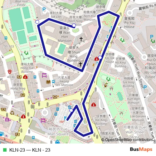 The first stop of the KLN-23 bus route is Yue Man Square Public Transport Interchange and the last stop is Wan Hon Street, Near Nam Ning Mansion. KLN-23 (KLN - 23) is operational during on weekdays.
