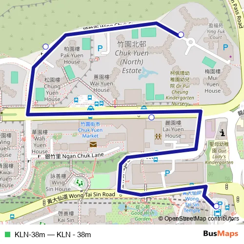 The first stop of the KLN-38m bus route is Wong Tai Sin Public Light Bus (Scheduled) Service Terminus and the last stop is Wing Chuk Street, outside Toa Yuen House, Chuk Yuen North Estate. KLN-38m (KLN - 38m) is operational during everyday.