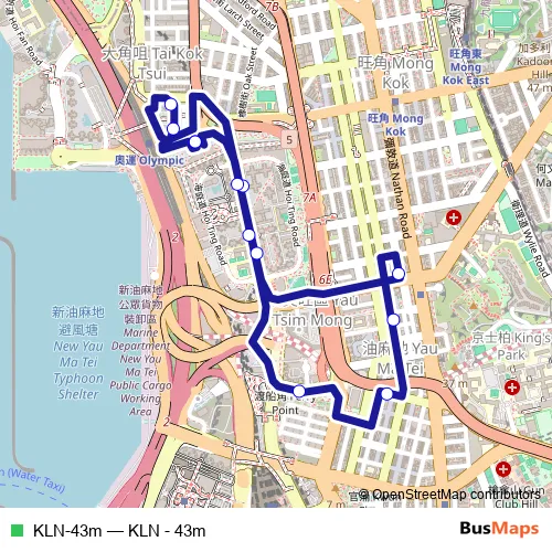 The first stop of the KLN-43m bus route is Tai Kok Tsui (Cherry Street) GMB Terminus and the last stop is Tai Kok Tsui (Cherry Street) GMB Terminus. KLN-43m (KLN - 43m) is operational during everyday.