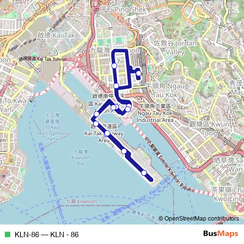 The first stop of the KLN-86 bus route is Kai Tak Cruise Terminal and the last stop is Kai Tak Cruise Terminal. KLN-86 (KLN - 86) is operational during everyday.