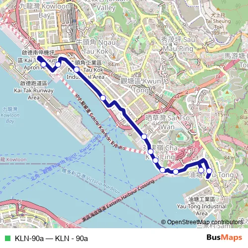 The first stop of the KLN-90a bus route is Shing Cheong Road, near Hong Kong Children's Hospital and the last stop is Yau Tong (Yau Lai Estate) Minibus Terminus. KLN-90a (KLN - 90a) is operational during on weekdays.