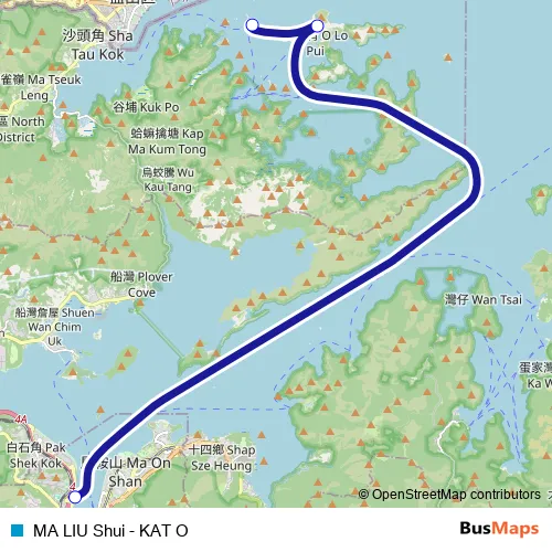The first stop of the MA LIU Shui - KAT O ferry route is Ma Liu Shui New Ferry Pier and the last stop is Ap Chau Public Pier. MA LIU Shui - KAT O (MA LIU Shui - KAT O) is operational during everyday.