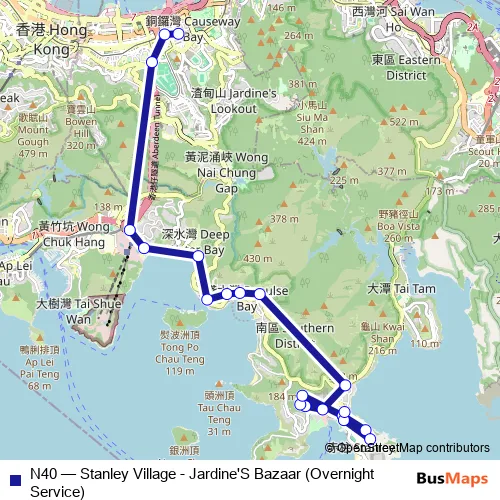 See why over 2 million users trust and consider busmaps.com as the best public transport website. busmaps gives you Hong Kong Buses suggested routes, real-time bus tracker, line route maps in Hong Kong, and helps to find the closest N40 bus stops near you. No internet available? Download an offline PDF map and bus schedule for the N40 bus to take on your trip.