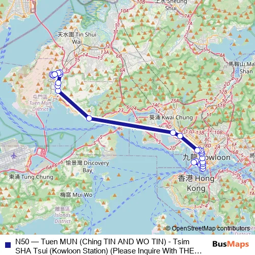 Click here to view the nearest N50 - Tuen MUN (Ching TIN AND WO TIN) - Tsim SHA Tsui (Kowloon Station) (Please Inquire With THE Operator About THE Payment Arrangement OF THE TWO-WAY Fare ON This Route.) bus stop.