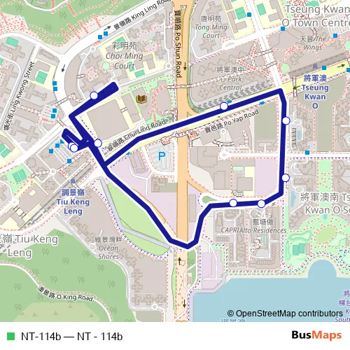 The first stop of the NT-114b bus route is Tiu Keng Leng MTR Station Minibus Terminus and the last stop is Tiu Keng Leng MTR Station Minibus Terminus. NT-114b (NT - 114b) is operational during everyday.