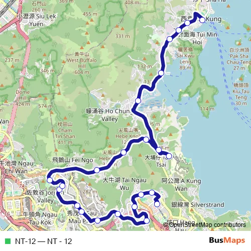 The first stop of the NT-12 bus route is Po Lam Public Transport Interchange and the last stop is Fuk Man Road Public Light Bus Terminus, outside King Wah Building. NT-12 (NT - 12) is operational during everyday.