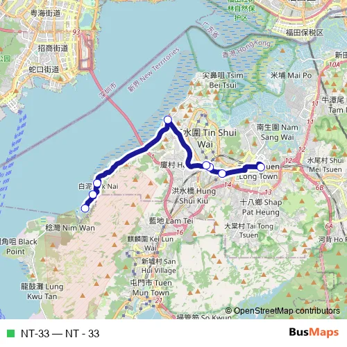 The first stop of the NT-33 bus route is Tai Fung Street, near Tsui Wah House and the last stop is Ha Pak Nai (Nim Wan Road) Minibus Terminus. NT-33 (NT - 33) is operational during everyday.