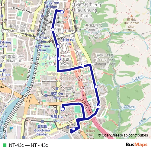 The first stop of the NT-43c bus route is Ho Pong Street, outside Tuen Mun San Hui Market and the last stop is Siu Hing Lane, outside Pok Oi Hospital Tuen Mun Nursing Home. NT-43c (NT - 43c) is operational during everyday.