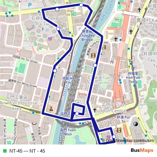 The first stop of the NT-45 bus route is Ho Wong Street, outside Tai Hing Gardens Phase I and the last stop is Ho Wong Street, outside Tai Hing Gardens Phase I. NT-45 (NT - 45) is operational during everyday.