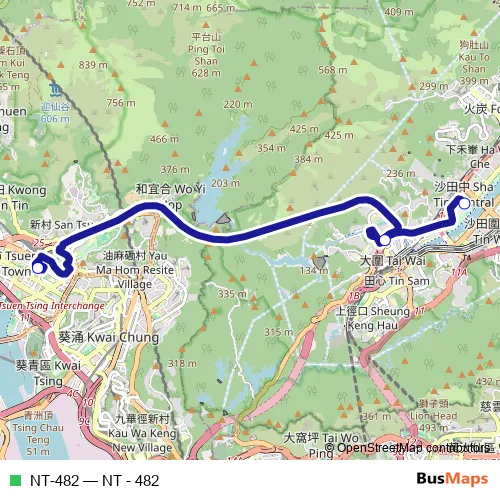 The first stop of the NT-482 bus route is Tam Kon Po Street, outside Sha Tin Town Hall and the last stop is Tsuen Wan Market Street. NT-482 (NT - 482) is operational during everyday.