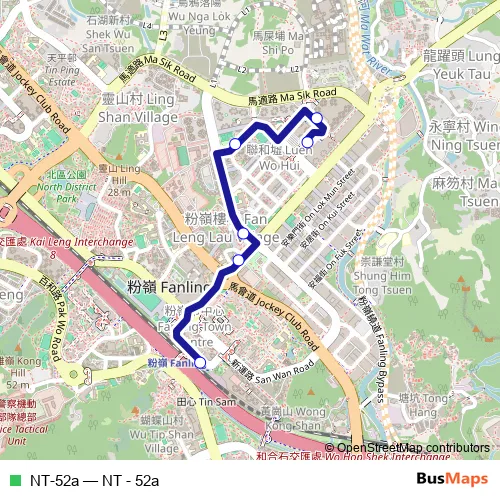 The first stop of the NT-52a bus route is Fanling Station Road, outside Fanling Station and the last stop is Wo Mun Street Public Light Bus Terminus (Wo Mun Street Public Light Bus (Scheduled) Service Terminus). NT-52a (NT - 52a) is operational during everyday.
