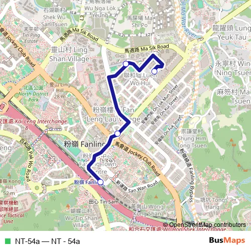 The first stop of the NT-54a bus route is Fanling Station Road, outside Fanling Station and the last stop is Wo Mun Street Public Light Bus Terminus (Wo Mun Street Public Light Bus (Scheduled) Service Terminus). NT-54a (NT - 54a) is operational during everyday.