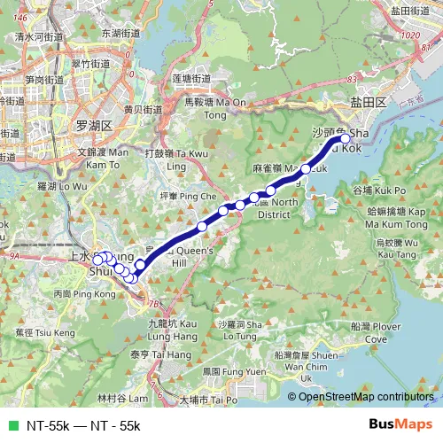 The first stop of the NT-55k bus route is Sha Tau Kok Public Transport Interchange and the last stop is Sheung Shui Station Public Light Bus Terminus. NT-55k (NT - 55k) is operational during everyday.