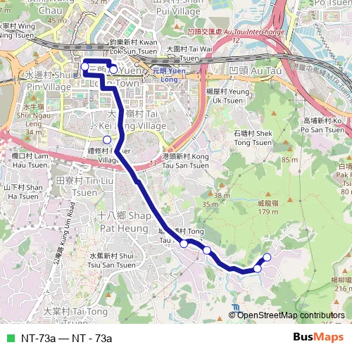 The first stop of the NT-73a bus route is Yuen Long (Sung Shan San Tsuen) Minibus Terminus and the last stop is Fook Hong Street, near Kam Bo Building. NT-73a (NT - 73a) is operational during on weekdays.