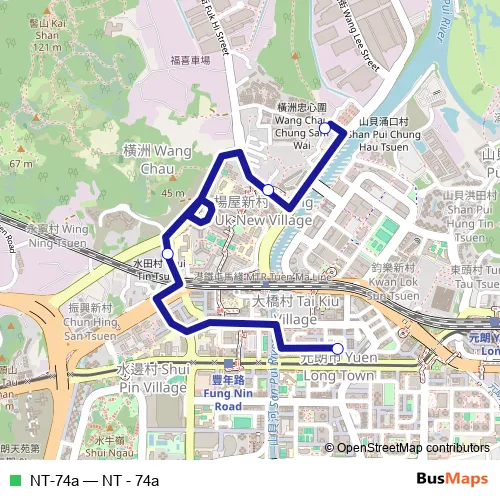 The first stop of the NT-74a bus route is Fook Hong Street, near Kam Bo Building and the last stop is 蔡福善堂, Wang Chau Tung Tau Wai. NT-74a (NT - 74a) is operational during everyday.