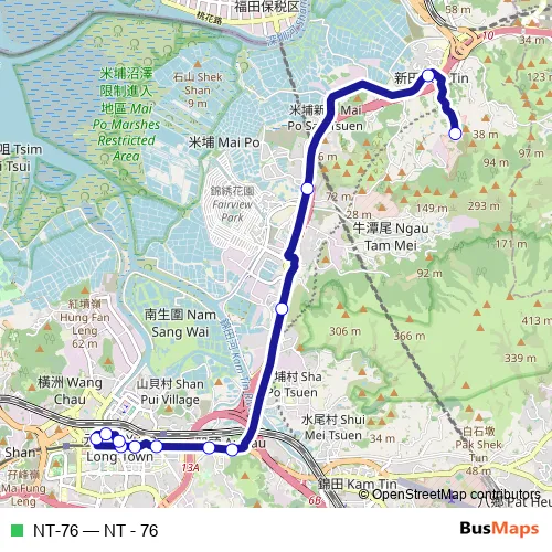 The first stop of the NT-76 bus route is Ka Lung Road, near San Tin Barracks Block 12 and the last stop is Fook Hong Street, near Kam Bo Building. NT-76 (NT - 76) is operational during everyday.
