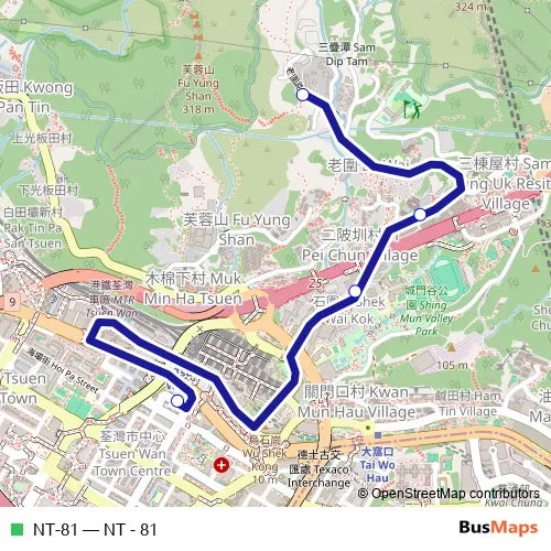 The first stop of the NT-81 bus route is Tsuen Wan (Shiu Wo Street) and the last stop is Lo Wai. NT-81 (NT - 81) is operational during everyday.