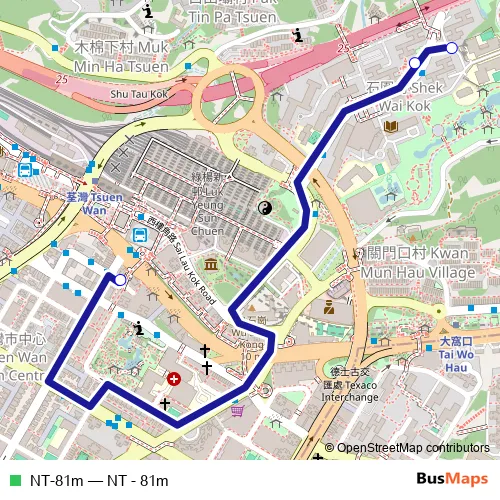 The first stop of the NT-81m bus route is Tsuen Wan (Shiu Wo Street) and the last stop is Shek Wai Kok Estate. NT-81m (NT - 81m) is operational during on weekdays.