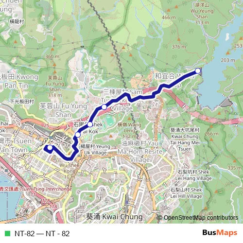 The first stop of the NT-82 bus route is Shing Mun Reservoir and the last stop is Tsuen Wan (Shiu Wo Street). NT-82 (NT - 82) is operational during everyday.